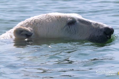 A wildlife photographer spots a swimming polar bear, completing the last lap of its summer migration. It’s the perfect photo op