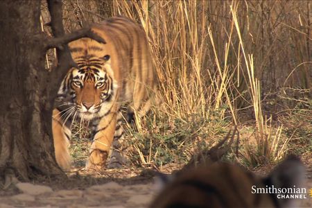 A young tiger comes face-to-face with an encroaching male tiger, threatening to take over his father’s territory