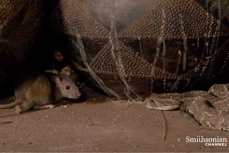 A puff adder has just bitten a rat, injecting it with enough venom to finish it off. The next step is to swallow it whole