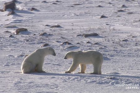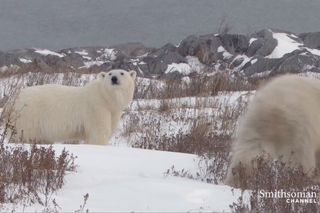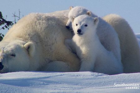 After a long winter in their den, a polar bear mother and her cubs emerge at the first signs of spring.