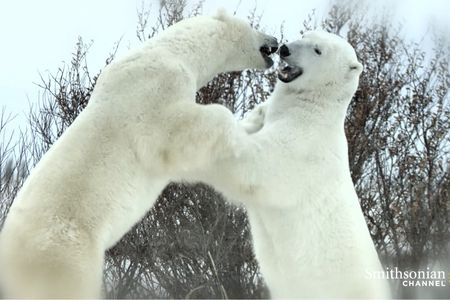 A car horn outside Churchill, Manitoba, causes a curious polar bear mom and her cub to scurry in opposite directions
