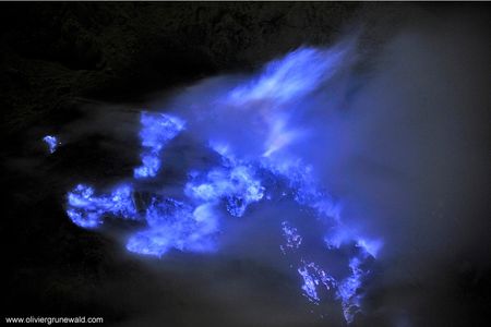 Olivier Grunewald’s dramatic photos showcase blue flames—not blue lava—that result from burning sulfur