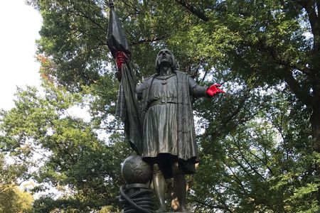 Vandals covered the statue’s hands in red paint and wrote “Hate will not be tolerated” on its base