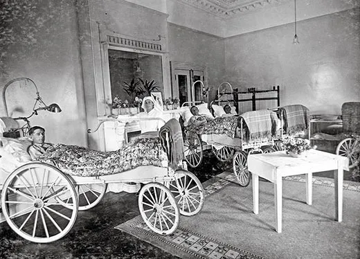Many treatments abounded for the neurasthenic soldier. The most notorious were undoubtedly Dr. Lewis Yealland’s electric shock therapies, conducted at the National Hospital for Paralysed and Epileptic, at Queen Square, London, where he claimed his cure “had been applied to upwards of 250 cases” (an unknown number of which were civilian). Yealland asserted that his treatment cured all the most common “hysterical disorders of warfare”—the shaking and trembling and stammering, the paralysis and disorders of speech—sometimes in a single suspect half-hour session. Electric heat baths, milk diets, hypnotism, clamps and machines that mechanically forced stubborn limbs out of their frozen position were other strategies. As the war settled in, and shell shock—both commotional and emotional—became recognized as one of its primary afflictions, treatment became more sympathetic. Rest, peace and quiet, and modest rehabilitative activities became the established regimen of care, sometimes accompanied by psychotherapy sessions, the skillful administration of which varied from institution to institution and practitioner to practitioner.