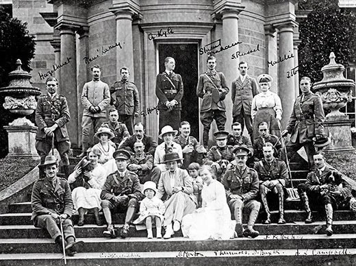 The fate of some officers is made evident by Lady Clementine’s correspondence: “Dear Lady Waring...my poor boys death is a dreadful blow and I cant realize that he has gone forever....Oh it is too cruel after waiting three long weary years for him to come home.” Very occasionally, too, it is possible to track an officer through an unrelated source. A photograph that had been in the possession of Capt. William McDonald before he was killed in action in France, in 1916, and which is now archived in the Australian War Memorial, shows him gathered with other officers on the Lennel House steps, with Lady Clementine. Some later hand has identified among the other men “Captain Frederick Harold Tubb VC, 7th Battalion of Longwood,” and noted that he died in action on 20 September 1917; this is the same “Tubby” who had written to Lady Clementine a month earlier, at the completion of an 11-hour march, heading his letter simply “In the Field”: “An aeroplane tried to shoot us last night with a m[achine] gun besides dropping sundry bombs around. It rained a heavy storm last night. It is raining off an[d] on today. The weather is warm though. My word the country round here is magnificent, the splendid wheat crops are being harvested....”