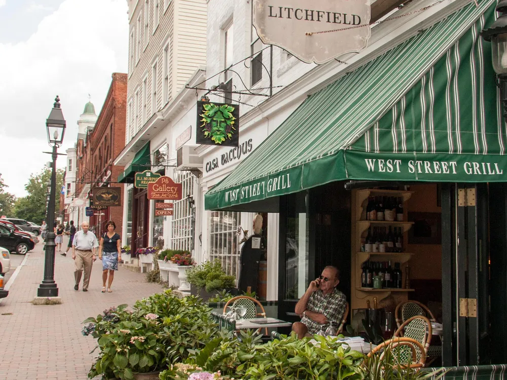 Downtown Litchfield is brimming with antique stores, clothing boutiques and restaurants, including the Market Place Tavern, an American eatery located within the old Litchfield jail (its early 19th-century jail cells are still visible). Other local dining spots include the landmark Village Restaurant and the long-running West Street Grill, a French- and Italian-inspired bistro where celebrity sightings are commonplace. For more than 50 years, The Dutch Epicure Shop has been tempting local residents and visitors alike with Black Forest cake, seasonal pies and fruit tarts. Although visits to the main property are currently on hold, Litchfield’s award-winning Arethusa Farm serves up scoops of old-fashioned ice cream in flavors like strawberries and sweet cream chocolate chip at various regional storefronts, including one in nearby Bantam.