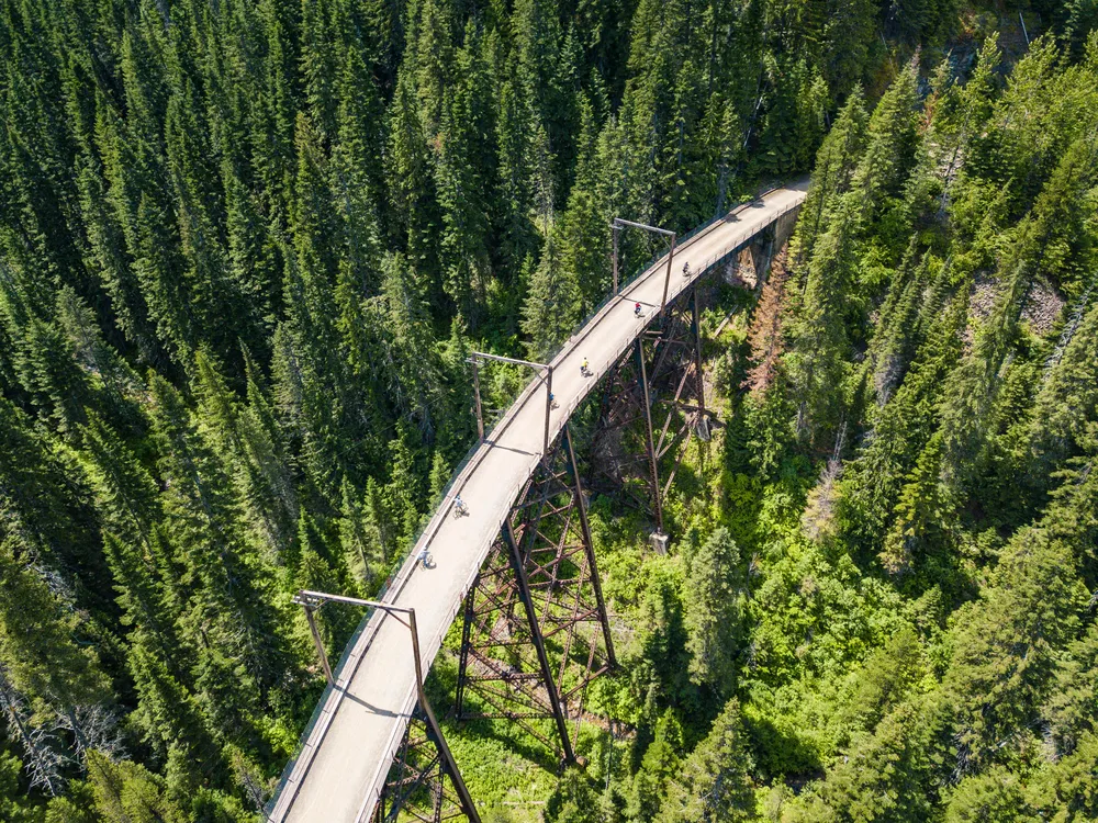 The surrounding forests are a hotbed of outdoor activity, from ziplining and skiing to hiking and bicycling along the Route of the Hiawatha, a 15-mile-long “crown jewel” of rail-to-trail adventures that passes beside waterfalls, across sky-high train trestles, and through old railway tunnels. The Trail of the Coeur d'Alenes is another rail-to-trail stunner that runs for 73 miles, traveling alongside Wallace and the shore of Lake Coeur d'Alene as it winds through the mountainous Silver Valley.